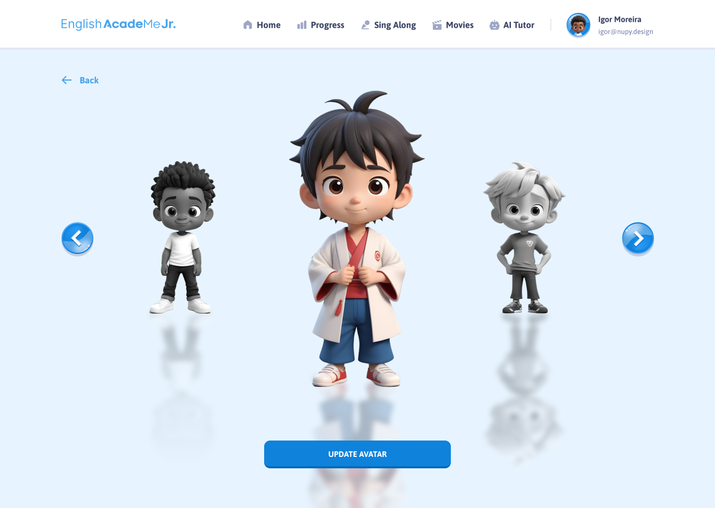 The Student Dashboard allows students to track their own progress, change their avatars, update their details, and view reports. Additionally, it features a karaoke section where students can sing along to Disney songs from movies, making learning fun and engaging.