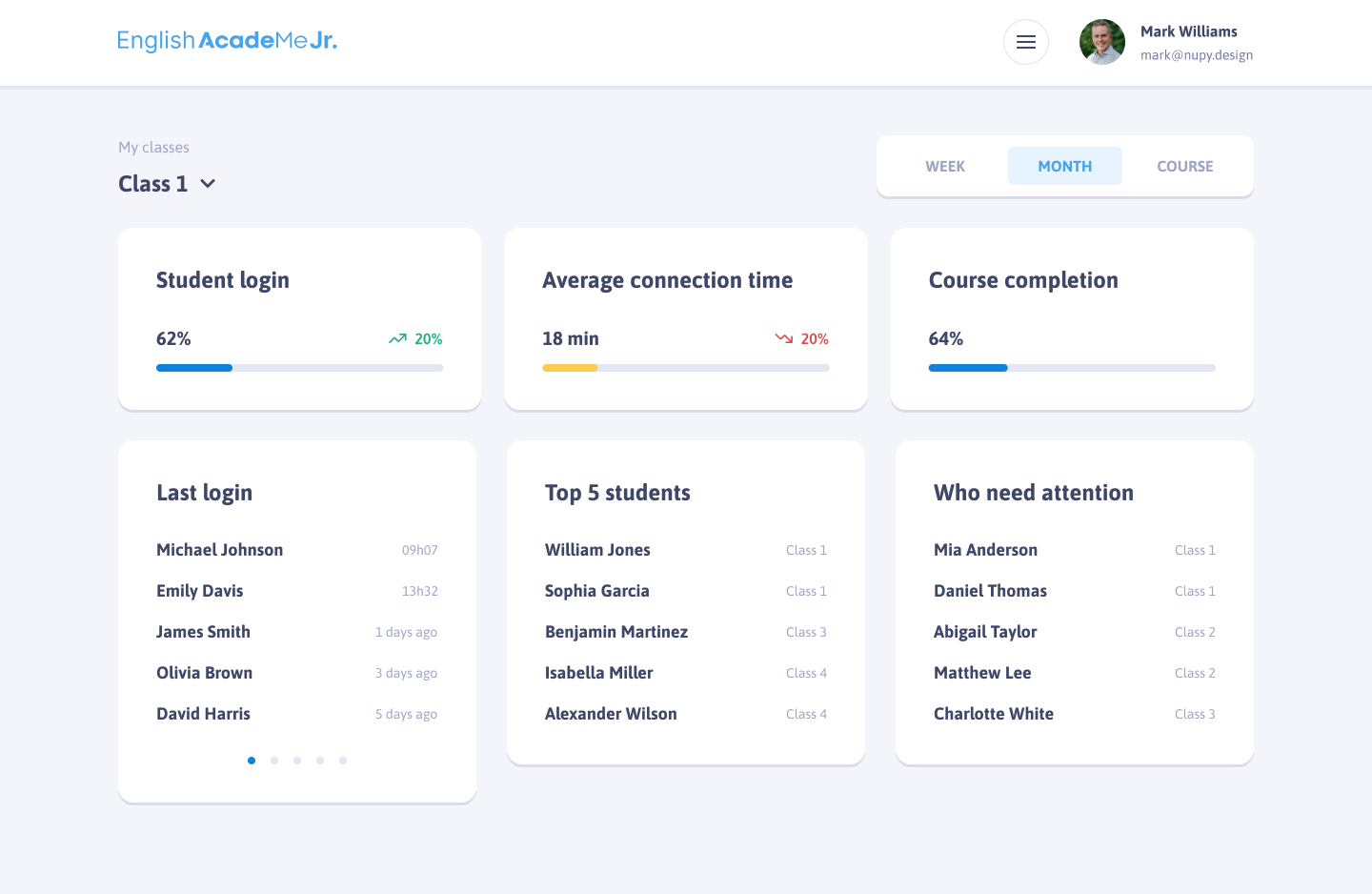 The Teachers Dashboard allows educators to see the activity and skills progress of a classroom or individual student. Teachers can change lessons, make lesson plans, and access various educational resources to enhance the learning experience.